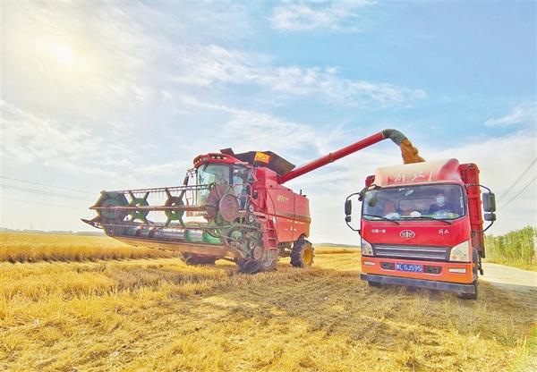 近日,扶沟104万亩小麦陆续开镰收割,一派喜人的丰收景象。图为5月30日,在扶沟县固城乡护岭村,一辆联合收割机将小麦装车。