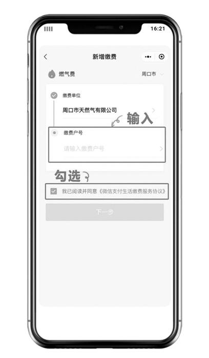 步骤一:打开微信,点击右下角“我”,点击“支付”,即可找到“生活缴费”入口;步骤二:进入“支付”页面后,选择“生活缴费”;步骤三:点击“生活缴费”,选择“燃气费”(右上角城市选择“周口市”);步骤四:点击“燃气费”进入页面后,选择您所属“缴费单位”,分别为周口市、鹿邑县、西华县、郸城县、项城市;步骤五:选择相应缴费单位后,输入您12位数字的缴费用户号后,勾选“我已阅读并同意《微信支付生活缴费服务协议》”,点击“下一步”,即进入缴费页面。