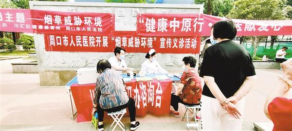 5月31日上午,周口市人民医院联合川汇区健康教育所在小桥办事处建中社区核酸采集点开展第35个世界无烟日宣传义诊活动,本次活动主题为“烟草威胁环境”。 记者 史书杰 摄