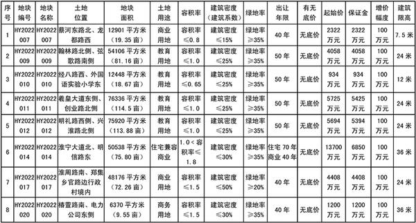 备注:1.具体建设方案须报规划部门批准后实施,土地出让合同签订后,12个月内必须开工建设,工期30个月,土地成交价款需在土地出让合同签订后60日内交清,交地时间6个月内。2.根据淮政〔2019〕45号文件精神,竞得人摘牌土地后,应将项目施工标发包给在淮阳设立公司的施工单位;房地产开发项目非淮阳境内企业竞买人在竞买申请时,申请书中应明确成立新公司、公司出资构成及成立时间。3.HY2022014地块内兼容商业设施建筑面积不得超过地上总建筑面积的10%,并集中配置,需配建配套6班幼儿园,配套幼儿园由开发建设单位负责建设,建成后无偿移交政府;HY2022020宗地竞得人须无偿代建东侧坑塘绿化。4.HY2022009宗地地上附属物和土地进行捆绑出让,地上资产价款(100130169元)由竞得人支付给周口市淮阳外国语实验小学。账户名:淮阳外国语实验小学,开户行:中国银行淮阳支行,账号:249435936964。HY2022010宗地地上附属物和土地进行捆绑出让,地上资产价款(40130015元)由竞得人支付给淮阳外国语实验幼儿园。账户名:淮阳外国语实验幼儿园,开户行:中国建设银行淮阳支行,账号:41050170660800000340。HY2022011宗地地上附属物和土地进行捆绑出让,地上资产价款(156201422元)由竞得人支付给周口市淮阳区羲城中学。账户名:周口市淮阳区羲城中学,开户行:中原银行淮阳支行,账号:10029120200000000453。HY2022012宗地地上附属物和土地进行捆绑出让,地上资产价款(19393万元)由竞得人支付给周口市淮阳区阳光学校,账户名:周口市淮阳区阳光学校,开户行:中国农业银行淮阳支行,账号:16572101040014858。5.土地竞买保证金必须以竞买申请人(单位)自身的名义交纳,竞买申请人(单位)与缴款人(单位)名称不一致的,无法确认其竞买资格,交纳款项无效。6.具体以规划部门出具的规划指标为准,详见规划设计条件或批复文件。