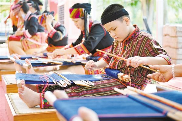 6月11日,一名小朋友在展示黎族织锦技艺。当日,2022年文化和自然遗产日海南省宣传展示暨第二届三亚南山非遗节在海南省三亚市南山文化旅游区举行,海南省数十个非遗项目进行展示,吸引了众多游客前来感受海南传统文化的魅力。新华社记者 郭程 摄