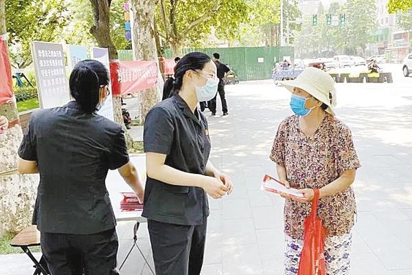 通过开展防范非法集资宣传月普法宣传活动,有力提高了社会公众对非法集资危害性的认识,营造了全社会共同防范非法集资的良好舆论氛围。图为干警一边发放宣传页,一边向市民介绍如何识别和防范非法集资。