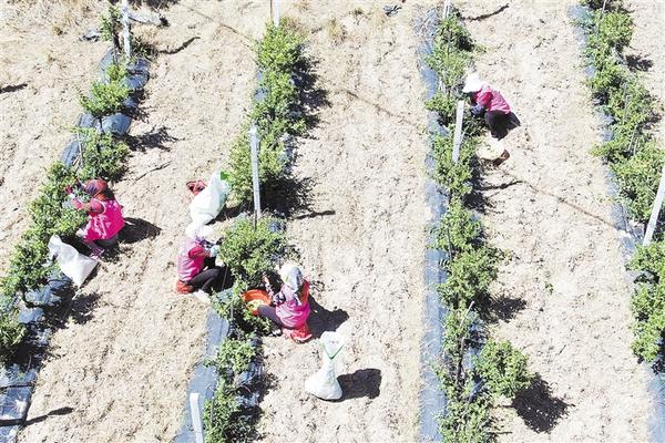 甘肃通渭:金银花香,采售繁忙 6月14日,务工人员在甘肃省定西市通渭县李家店乡姚川村采摘金银花(无人机照片)。近日,甘肃省定西市通渭县的金银花香气四溢,农户和务工人员赶着花期忙着采摘,加工车间全力运转进行收购、烘干工作。近年来,当地大力发展金银花产业,全县金银花种植基地累计达14万亩,金银花产业已经成为当地农民增收致富的主要产业。新华社记者 马希平 摄