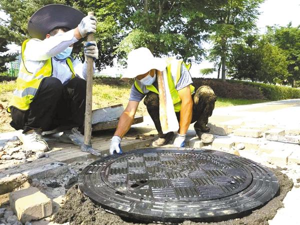 由于新的窨井盖较重且大,需使用电锤将旧井盖周围地面砖块粉碎,扩宽井口,然后由施工人员同时用撬棒别住才能将井盖顺利放入井口。窨井盖放入井口工作还没有结束,施工人员还要进行找平、抹灰、固定、抹缝等工序,保证新更换的井盖美观结实。值得注意的是,施工人员还会根据道路方向将井盖旋转至合适位置,方便行人看到井盖上的提示文字。