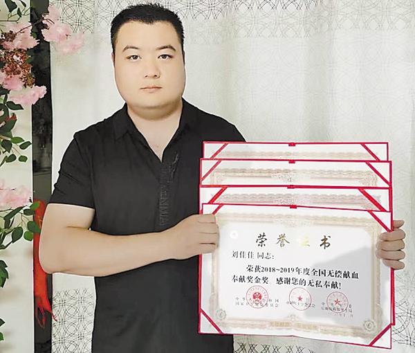 无偿献血是一件很容易做到但不容易坚持做下去的事,做一件好事并不难,难得的是一辈子坚持做同一件好事。作为无偿献血志愿者,刘佳不仅按时无偿献血,还经常参与市中心血站的宣传活动,并利用空闲时间以自己的献血经历为例向家人、同事普及献血知识。在他的鼓励下,家人、同事也纷纷参与到了无偿献血的队伍中。