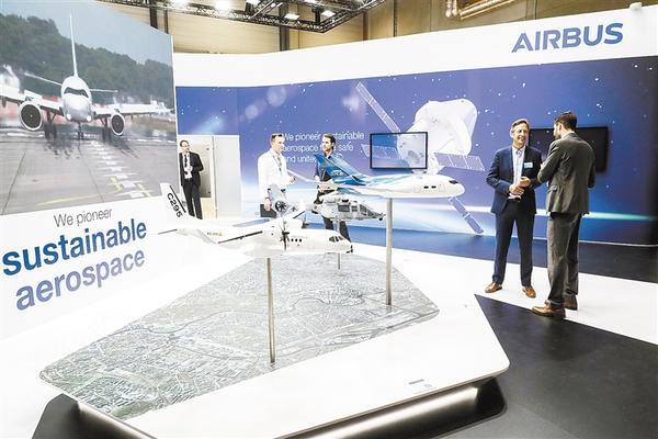 6月22日,在德国首都柏林南郊,人们在空中客车公司展区交谈。