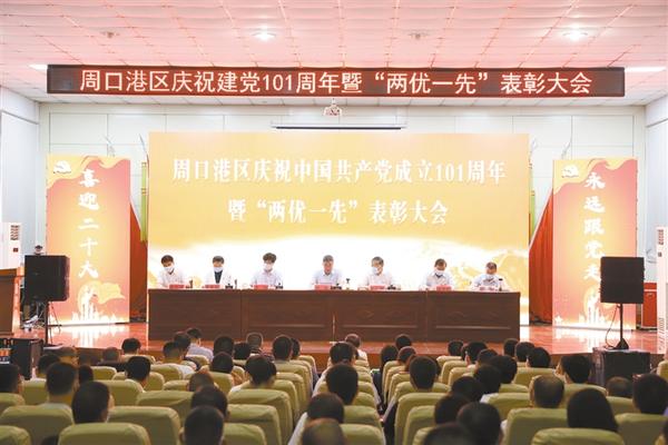 本报讯 (记者 宋风 文/图) 6月27日,周口港区隆重举办庆祝建党101周年暨“两优一先”表彰大会(如图),共同庆祝党的诞辰。港区党委书记孙鹏出席会议并讲话,港区党委委员杜广贤主持会议,港区党委委员、管委会副主任李翔,港区党委委员、管委会副主任刘学庆,港区党委委员、纪委书记李素芹,市公安局港区分局党委书记、局长康群泉,港区二级调研员张东立出席大会。