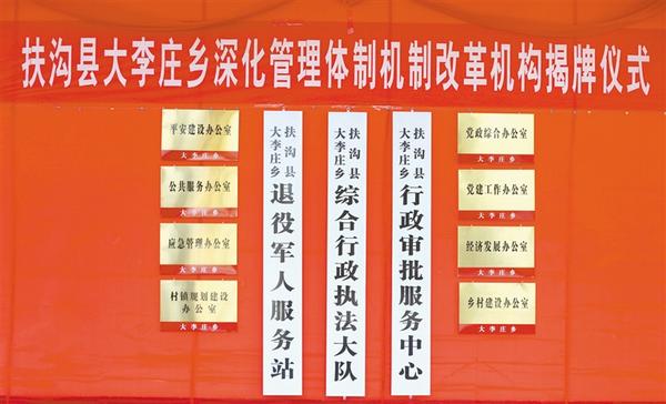 本报讯 (记者 金月全) 为进一步落实省委、省政府关于乡镇管理体制机制改革的决策部署,6月24日,扶沟县大李庄乡举行11个新设置机构揭牌仪式。