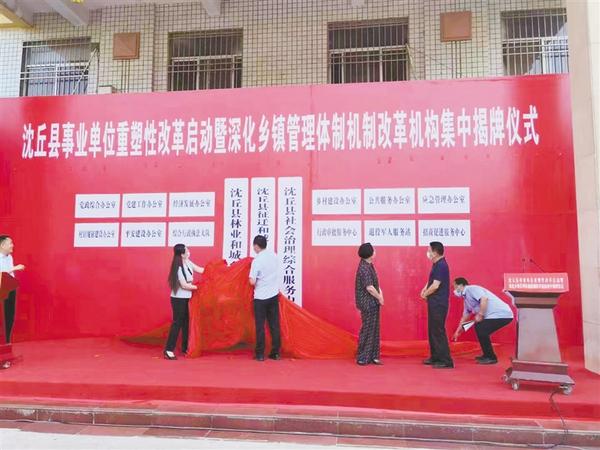 本报讯 (记者 高洪驰 文/图) 6月20日,沈丘县举行全县事业单位重塑性改革启动暨深化乡镇管理体制机制改革集中揭牌仪式,为新成立的县林业和城乡绿化中心、县征迁和城乡规划建设服务中心、县社会治理综合服务中心举行集中揭牌(如图),并为22个乡镇(办)下沉机构集中发放了新印章,推动事业单位重塑性改革暨深化乡镇管理体制机制改革向纵深开展。