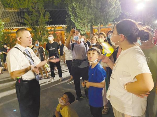 自关帝庙开展免费夜游活动以来,截至目前入园游客累计达2.2万人次。免费夜游活动带动了关帝庙周边餐饮业发展,提升了城市“烟火气”,活跃了周口夜经济。图为游客正在认真聆听工作人员讲解关帝庙景区文化。