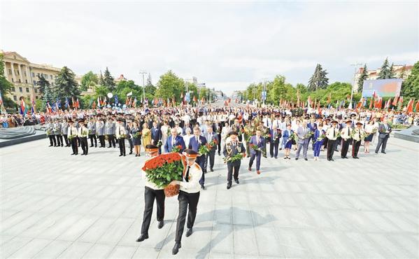 7月3日,人们在白俄罗斯明斯克胜利广场向胜利纪念碑献花。