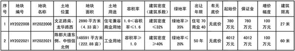 备注:1.具体建设方案须报规划部门批准后实施,土地出让合同签订后,12个月内必须开工建设,工期30个月,土地成交价款需在土地出让合同签订后60日内缴清,交地时间6个月内。2.根据淮政〔2019〕45号文件精神,竞得人摘牌土地后,应将项目施工标发包给在淮阳设立公司的施工单位;房地产开发项目非淮阳境内企业竞买人在竞买申请时,申请书中应明确成立新公司、公司出资构成及成立时间。3.土地竞买保证金必须以竞买申请人(单位)自身的名义缴纳,竞买申请人(单位)与缴款人(单位)名称不一致的,无法确认其竞买资格,缴纳款项无效。4.HY2022008宗地地上有8栋违章建筑,地上建筑评估价值为1534770元,地上附着物与土地捆绑出让。竞得人须另将地上附属物资金及时汇入周口市淮阳区财政局非税收入专户。(账户名:周口市淮阳区财政局非税收入专户,开户行:中国建设银行淮阳支行:账户:41001557910050001478)。HY2022021宗地为“标准地”出让,“标准地”控制性指标为:入驻该宗地的具体产业类型为电气机械和器材制造业,投资强度不低于260万元/亩,亩均税收不低于6万元/亩,具体由周口先进制造业开发区管理委员会负责监督监管。竞得人需与管委会签订《工业用地“标准地履约监管协议”》,并出具《“标准地”企业信用承诺书》。5.具体以规划部门出具的规划指标为准,详见规划设计条件或批复文件。