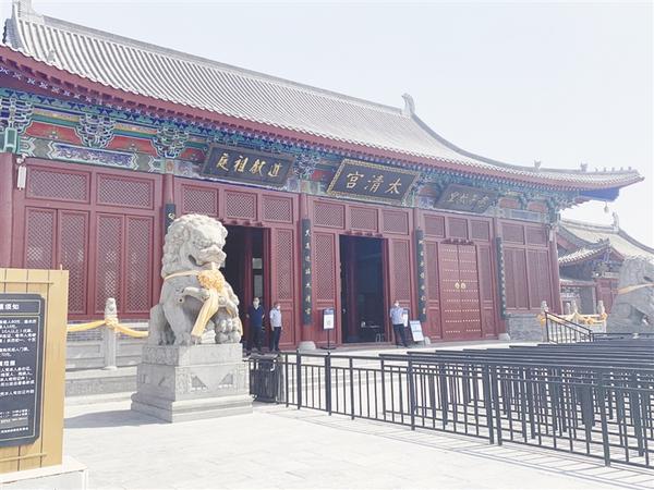 湛蓝的天空下,太清宫红墙青瓦,两扇大红门映入眼帘,门顶上挂着一个牌子,四周镶着金边,上有三个烫金大字“太清宫”,两侧各悬挂着一个牌子,写着“老子故里”“道教祖庭”。这古色古香的格调,使人油然而生庄重之感。