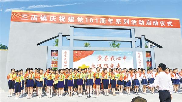 6月30日,伴随着少先队员齐声高唱的中国少年先锋队队歌《我们是共产主义接班人》,项城市三店镇拉开了庆祝建党101周年系列活动的序幕。启动仪式上,面对鲜红的党旗,党员们举起右手庄严宣誓,表达了对党的无限忠诚和为党的事业奋斗终身的决心。
