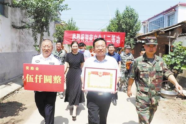 日前,西华县委常委、政法委书记贾鲲鹏,县委常委、县人武部上校政委涂友佳,副县长、县公安局长龙文钦,怀着对功臣模范的敬仰之情,带着腰鼓队敲锣打鼓,为荣立二等功的西华籍子弟兵张留军、李光辉送喜报。
