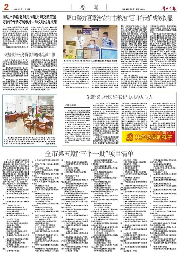 7月5日上午,按照省委、省政府统一部署,我市举行第五期“三个一批”项目建设活动,集中签约、开工、投产一批重大项目,这是我市进一步树牢“项目为王”理念、高效统筹疫情防控和经济社会发展的具体体现,也是动员全市上下聚精会神抓项目、扩投资、稳增长,确保圆满完成年度目标任务,加快周口高质量发展的重要举措。全市第五期“签约一批”项目40个,总投资337亿元;“开工一批”项目52个,总投资246.73亿元;“投产一批”项目58个,总投资255.38亿元。第五期“三个一批”项目清单如下: