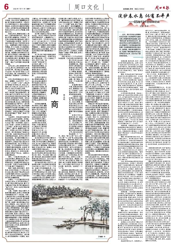 周口是沙颍河冲积的平原地带,本来以农业经济为主,原先相对较穷,人们为了生计才经商创业。周商既有北方人宽厚义气、责任担当、吃苦耐劳、坚忍不拔等特质,又因临水而居而灵动,有着南方人智慧精明、勇于拼搏、敢于冒险等特质。周口、周商与水有关,从渡口到埠口到港口,从繁荣到沉寂再到复兴。周商见证了周口的沧桑巨变、发展历程。如今的周口中心港墙檐云集、汽笛声声,周口正扬波远航,从黄土驶向深蓝,走向更加繁荣的未来,周商也会越来越昌盛。