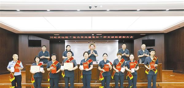 为推进“能力作风建设年”活动深入开展,全面提高干警政治、业务素质,在庆祝建党101周年之际,川汇区人民法院机关党委举办“能力作风建设年”征文活动。全院干警积极参与、踊跃投稿,活动共收到征文223篇,评选出特等奖2名、一等奖4名、二等奖6名、三等奖和优秀奖各10名。图为颁奖现场。