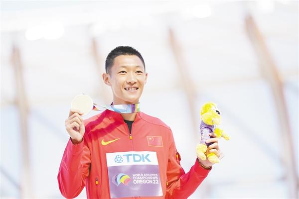 当日,2022世界田径锦标赛男子跳远颁奖仪式在美国俄勒冈州尤金市举行。