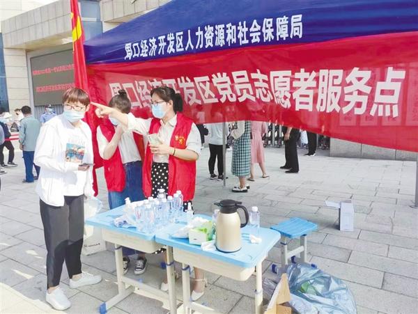 本报讯 (记者 王晨 文/图)7月9日,开发区组织30余名党员成立3支党员先锋队,在周口技师学院、周口职业技术学院等公务员考试考点设置服务点,开展党员志愿服务活动。