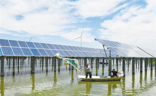 该光伏电站总装机容量80兆瓦,建设在约3000亩的鱼塘上,让鱼塘形成了“水上发电、水下养鱼”的绿色生态养殖模式,极大提高单位面积土地的经济价值。每年还以土地流转的方式让村民增收,进一步助力乡村振兴。新华社记者 孙凡越 摄