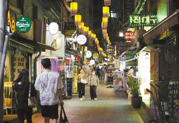 7月18日,人们走在韩国首尔的一条餐饮街上。