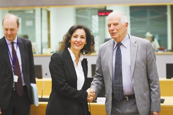 7月18日,在比利时布鲁塞尔,欧盟外交与安全政策高级代表博雷利(右)与比利时外交大臣拉比卜在会前握手。