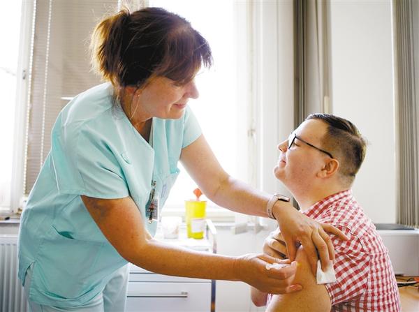 7月18日,在捷克布拉格,医护人员为一名男子接种新冠疫苗。