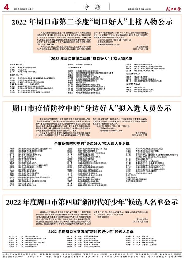 为体现公开、公正、公平原则,现将有关人员及群体名单予以公示,听取社会各界意见,接受广大群众监督。如有异议,可通过信件、邮件、电话等方式于2022年7月27日之前向周口市文明办反映。以单位名义反映的,请加盖本单位公章;以个人名义反映的,请使用真实姓名并提供具体联系方式。
