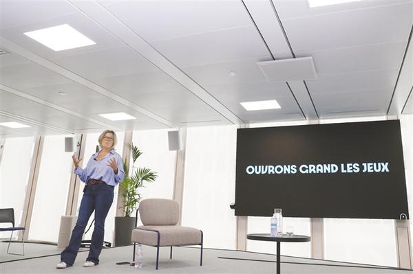 7月25日,2024年巴黎奥运会和残奥会口号在发布会现场屏幕上展示。当日,在巴黎奥运会即将迎来开幕倒计时两周年之际,巴黎奥组委公布了2024年巴黎奥运会和残奥会的口号:“OUVRONS GRAND LES JEUX”,中文可以叫“奥运更开放”。新华社记者 高静 摄