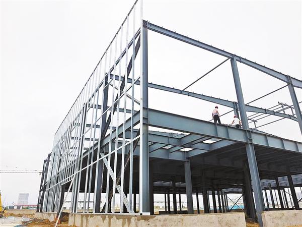 7月27日,在位于淮阳区工业二路东侧的周口鑫塑实业公司塑料CPP膜生产线项目工地,工人正在紧锣密鼓地构建标准化厂房。