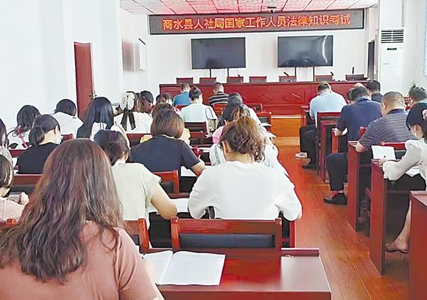 为敦促干部职工做尊法、学法、守法、用法的模范和表率,严格依照法定权限和程序行使权力、履行职责,8月1日上午,商水县人社局组织局机关87名干部职工进行了国家工作人员法律知识测试。图为县人社局干部职工正在进行答题。孙书 摄