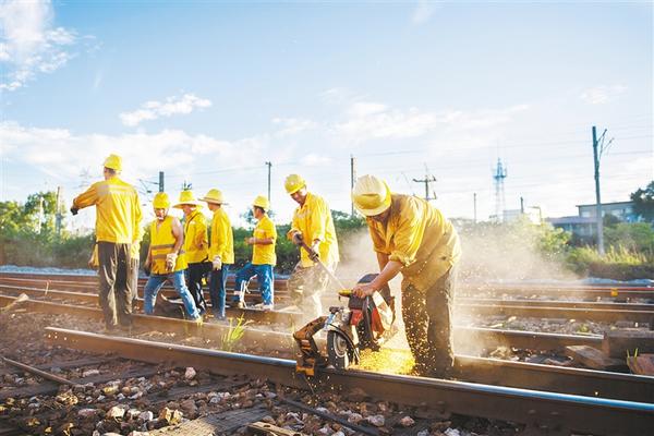 8月5日,在株洲北站编组场,铁路工人正在锯轨。