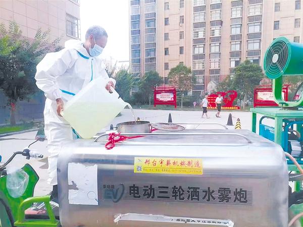 近日,扶沟县扶亭街道办事处以大街小巷、商超门店等重点路段的环境卫生整治为主要内容,全面清除卫生死角及乱堆乱放杂物。通过专业消杀设备,对辖区内排污渠道、社区楼栋、核酸检测点、公共服务设施等进行消杀和清理(如右图) ,杜绝“二次污染”。(记者 金月全 文/图)