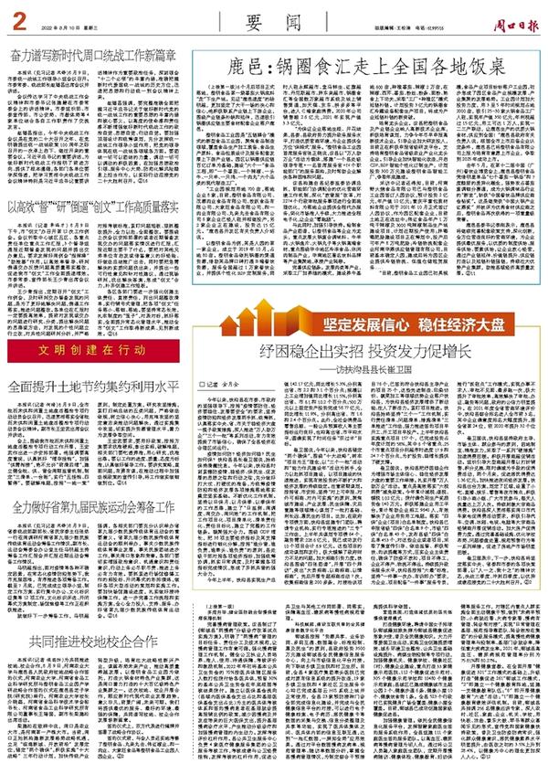 崔卫国说,扶沟县把纾困稳企作为增强市场主体信心、稳住经济发展大盘的重要工作举措。扎实开展“万人助万企”活动。重点是高效落实“六税两费”减免政策。今年累计减税、退税、缓税1.02亿元;拨付满负荷生产奖励资金140万元。积极搭建企业用工平台,累计帮助企业招工9640人,有效解决了企业用资用工难题。落实“四保”企业(项目)白名单制度。扶沟县已申报省级“四保”白名单9个,市级“四保”白名单43个,发布县级“四保”白名单453个,对这些企业或者项目,采取了集宣传引导、依法监督、积极帮扶、约谈提醒等方式,压实企业主体责任,确保了防疫不放松、项目不停工、企业不停产、物流不停运。持续提升政务服务水平,扶沟县按照“六最”标准,坚持“一件事一次办、有诉即办”要求,为企业、项目配备“一件事”服务专员,推行“派驻点”工作模式,实现办事不求人、审批不见面、最多跑一次,极大提升了审批效率,高效解决了审批、办证、融资等问题,政府的公信力明显提升。在2021年度全省营商环境评价中,扶沟县综合排名进入全市前3名,其中企业满意度排名大幅度提升,居全省第24位,较2020年提升32个位次。