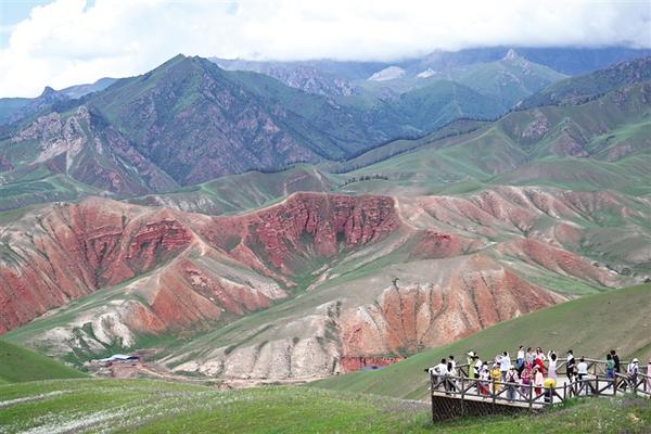8月10日,游客在青海省海北藏族自治州祁连县卓尔山景区内游玩。