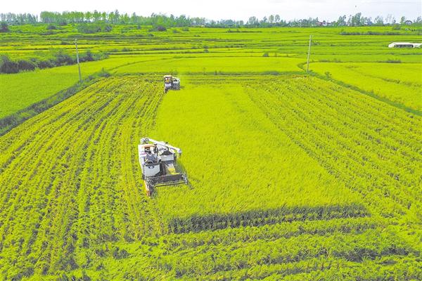 8月11日,河南省信阳市光山县罗陈乡张楼村农民驾驶农机抢收水稻(无人机照片)。近日,水稻进入收获期,各地农民抓紧农时收获、晾晒稻谷。新华社发