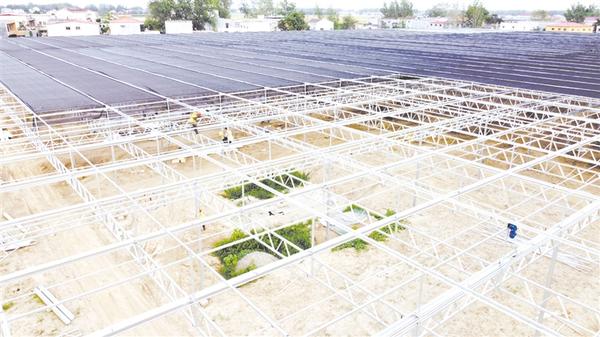 工人们正在位于淮阳区郑集乡官路边村的淮阳区西红柿产业融合示范园的钢架大棚上紧张施工(8月7日拍摄)。淮阳区西红柿产业融合示范园项目采取“政府+企业”的运营模式,建成后,其生态餐饮、研学体验、休闲采摘等综合年产值约为6500万元。 记者 刘俊涛 摄