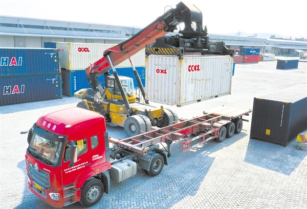 8月15日,福建泉州晋江国际陆地港区工作人员在吊装准备运往厦门港装船出口的集装箱。福州海关近日公布的统计数据显示,今年前7个月,福建省外贸进出口1.15万亿元人民币,比去年同期增长11.4%。新华社记者 林善传 摄