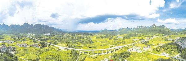 这是8月16日拍摄的位于广西环江毛南族自治县的贵南高铁桥梁和隧道(无人机全景照片)。