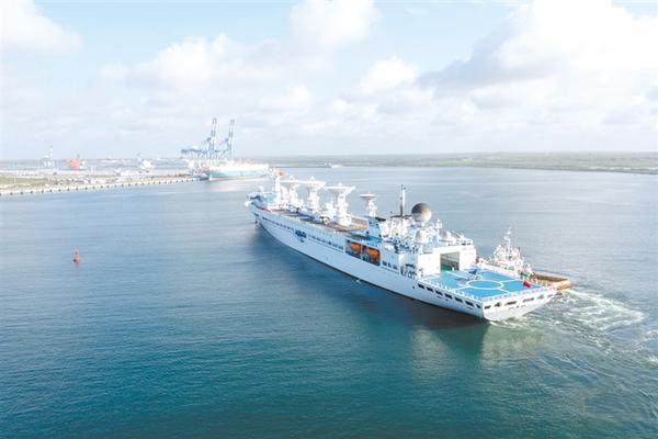 这是8月16日在斯里兰卡南部汉班托塔港附近拍摄的中国远望5号船。中国远望5号船16日停靠斯里兰卡南部汉班托塔港,进行物资补给。中国驻斯大使戚振宏和斯政府官员、中资机构代表等在码头迎接。新华社发