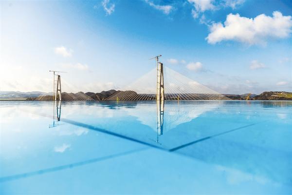 8月19日,贵州龙里河大桥倒映在一家酒店水池里。