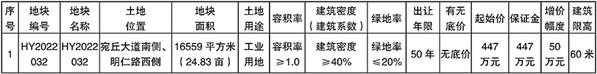 备注:1.具体建设方案须报规划部门批准后实施,土地出让合同签订后,12个月内必须开工建设,工期30个月,土地成交价款需在土地出让合同签订后60日内交清,交地时间6个月内。2.根据淮政[2019]45号文件精神,竞得人摘牌土地后,应将项目施工标发包给在淮阳设立公司的施工单位;房地产开发项目非淮阳境内企业竞买人在竞买申请时,申请书中应明确成立新公司、公司出资构成及成立时间。3.该宗工业用地为“标准地”出让,“标准地”控制性指标为:入驻该宗地的具体产业类型为橡胶和塑料制品业,投资强度不低于260万元/亩,亩均税收不低于6万元/亩,具体由周口先进制造业开发区管理委员会负责监督监管。竞得者需与管委会签订《工业用地“标准地”履约监管协议》,并出具《“标准地”企业信用承诺书》。经周口先进制造业开发区管理委员会函告我局,该宗地地上资产评估价值为13973530元,地上资产与土地捆绑出让,土地成交后,竞得人须另将地上资产价款及时汇入周口市淮阳区产业集聚区管理委员会账户,开户行:中原银行淮阳支行,账号:10029120110000000041。4.土地竞买保证金必须以竞买申请人(单位)自身的名义交纳,竞买申请人(单位)与交款人(单位)名称不一致的,无法确认其竞买资格,交纳款项无效。5.具体以规划部门出具的规划指标为准,详见规划设计条件或批复文件。
