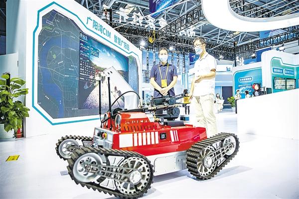 8月22日,嘉宾在2022智博会重庆南岸展厅内了解巡查处置机器人的应用场景。 当日,2022中国国际智能产业博览会在重庆开幕,来自国内外的500多家参展单位通过线上或线下方式,集中展示大数据智能化科技新成果,推动智能科技和产业加快发展。新华社记者 黄伟 摄