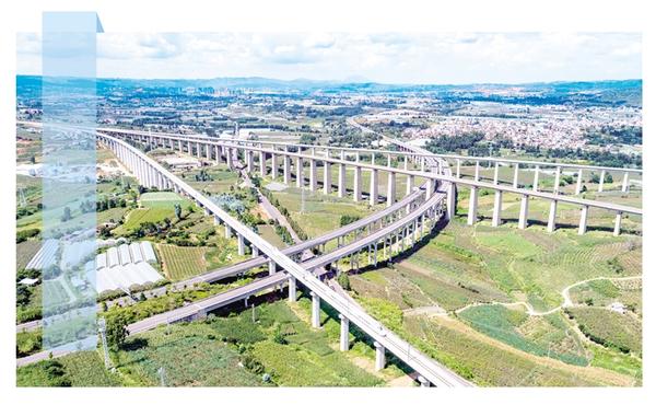 8月23日,综合检测车在弥蒙高铁弥勒站附近上行线行驶,远处是下行线,中间横向铁路是南宁至昆明客运专线,下穿高速是泸弥高速(无人机照片)。 近日,云南省红河州弥勒至蒙自高铁(弥蒙高铁)进入联调联试阶段,全线开通运营进入倒计时。弥蒙高铁位于云南省红河哈尼族彝族自治州境内,正线长约107公里,设计开行旅客列车时速目标值为250公里。全线新建红河站、开远南站、朋普站、竹园站4座车站。 新华社发