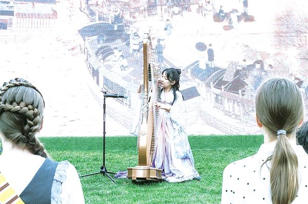 8月27日,小演员在招待会上表演箜篌独奏《清明上河图》。