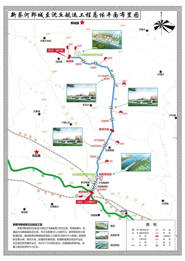 记者了解到,规划中的郸城港区是以新蔡河为依托,通过分析论证,确定其位置在新蔡河航运工程航道起点郸城县钱店镇,航道终点为沈丘县新安集沙颍河口,航道里程31公里。航道通航标准为限制性Ⅳ级,设计船舶为500吨级。航道底宽40米,最小设计水深3.1米,最小弯曲半径320米。船闸按照Ⅳ级船闸标准建设。沿线建设沈丘港区新安集、郸城港区钱店两个作业区,设计500吨级泊位8个,改建碍航桥梁标准9座。初步估算,工程总投资19.4亿元。
