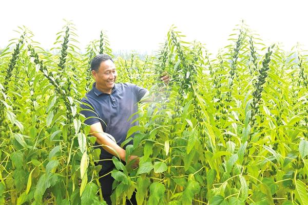 (下图为:种粮大户刘天华雨后察看芝麻长势。)②16