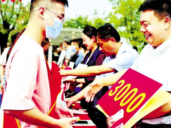 8月20日上午,太康县老冢镇2022年“山果”助学行动暨庆祝第38个教师节表彰大会在老冢镇刘寨村举行,对9个尊师重教先进行政村、8个教育工作先进单位、63名优秀教师、100名优秀中小学生、1名2022年考入北京大学的研究生及17名被双一流高校录取的学生进行了表彰,共发放奖教奖学资金10.36万元,咏絮书画院向获奖学生赠送了书画作品。图为表彰现场。记者 张洪涛 通讯员 穆杉 摄