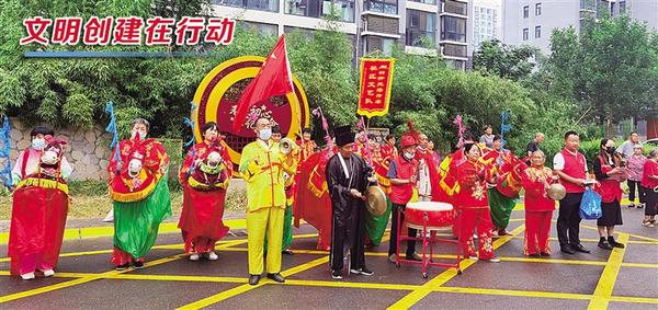 8月26日,太昊路办事处许寨社区文艺队在社区内敲锣打鼓宣传“创文”知识。 记者 王晨 摄